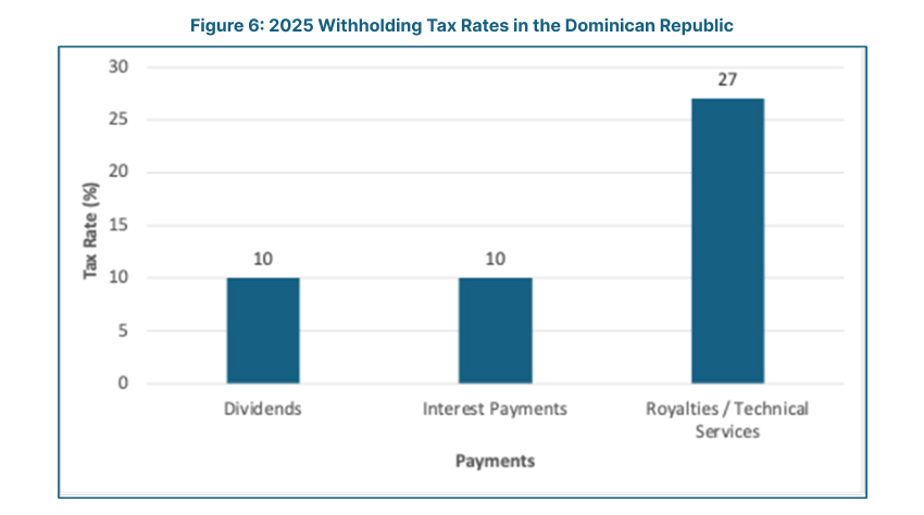 The withholding tax rates applicable in the Dominican Republic for 2025 are officially outlined by the Dirección  General de Impuestos Internos (DGII) and confirmed in investment documentation published by ProDominicana. These rates apply to payments made to foreign entities and are structured as follows: